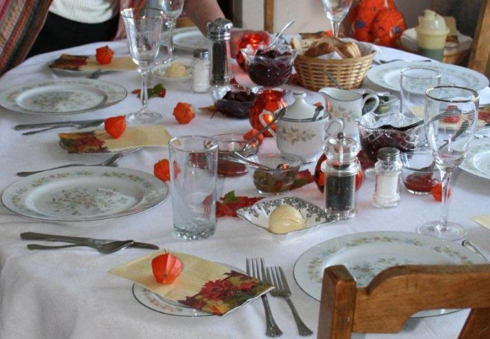 Mom: Uses a colourful, seasonal table cloth, and lights candles