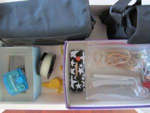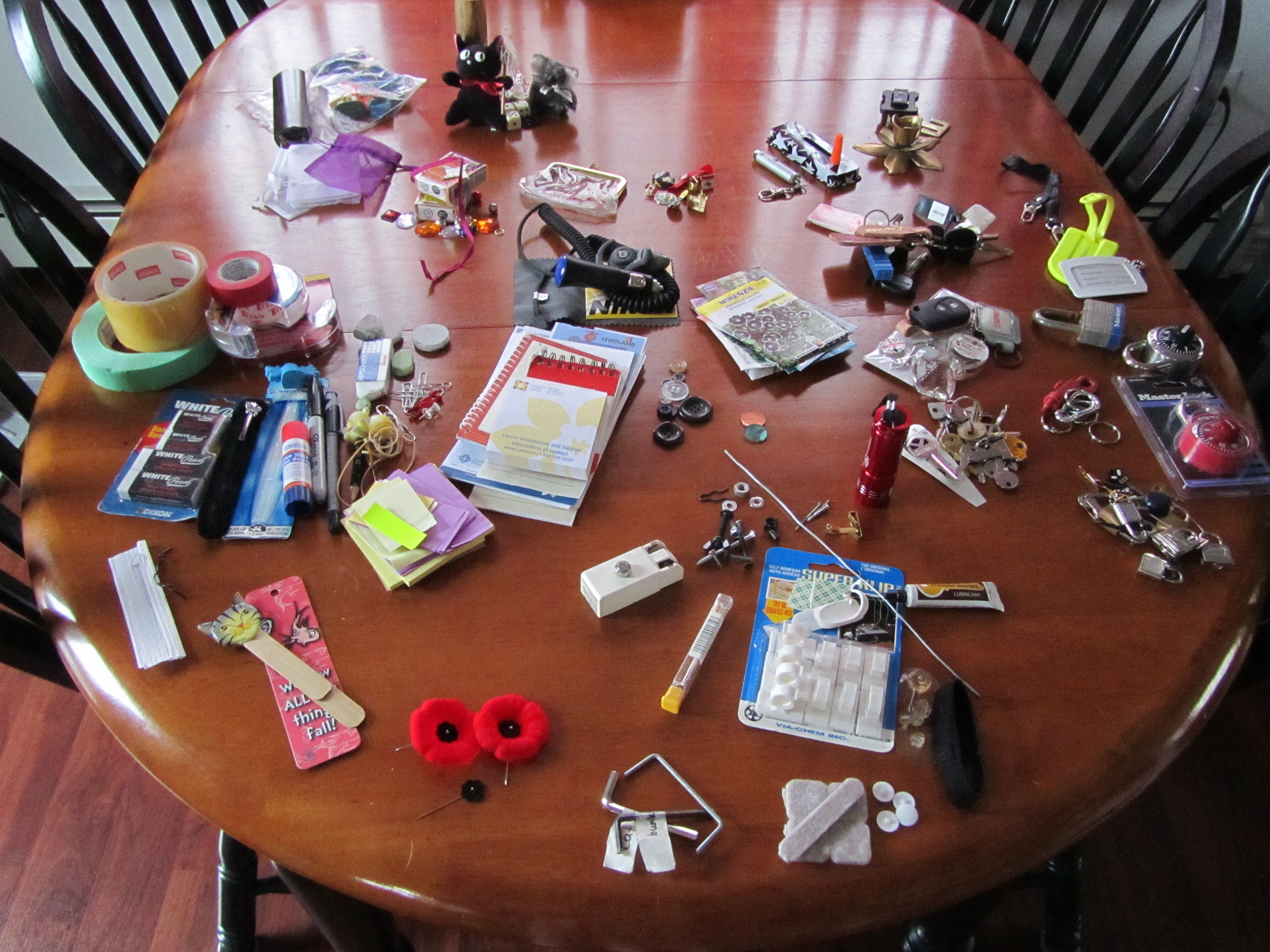 And here’s how it looks after resuscitation. The black bags contain binoculars and a wind-up radio for power outages. There is a pedometer, a whistle from the Brisco General Store, a roll of plastic string for the Whipper Snipper (strimmer), a painted box with window ornaments inside, and the reorganized bags of twist ties, elastics and fridge magnets.