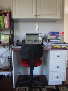 Come on in and visit my desk! Here is where you will find me blogging 2 or 3 times a week. However, I spend more time here than I care to admit, reading blogs, browsing the Internet, budgeting and paying bills. This is a little desk built into the kitchen, with a wall-hung pantry cupboard above. The drawers in the desk are the same 3 fearsome junk drawers I wrote about here.