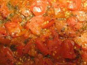 For batch 1, I just roasted chunks of tomato with olive oil, balsamic vinegar and Italian seasoning. I left it chunky and put it in jars. For batch 2, I did the same thing but added red peppers and onions. Both of these will be used in place of canned diced tomatoes in recipes, depending on whether spicy or plain would suit. And for batch 3, I went back to just tomatoes again, but seasoned with basil, salt, black pepper and a dash of sugar; then blended it, then thickened it by simmering it down on the stovetop. It’s good as-is for a tomato soup, or can be used as a sauce. It has about the same consistency as roasted red pepper soup. I left the skins on and seeds in all my tomatoes because they don’t bother me. My 15 lbs of tomatoes (plus 3 peppers and 3 onions) made twelve 2-cup jars which are now in the freezer.