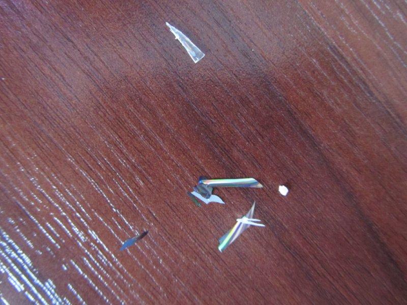 Easier said than done! Some of the discs were so plasticky and flexible that I couldn’t break them. Others shattered and sent shards flying all over the room. I ended up with cuts on my hands, and had to protect my face. Then I got worried that my cats would play with the shiny pieces and eat them. I took a break and vacuumed up the room. I could see that the CD materials were separating, leaving staticky bits of plastic film everywhere, similar to Christmas tree tinsel. I ended up having to damp-mop, like you do when you’ve broken a glass in the kitchen and you need to clean up every sliver.