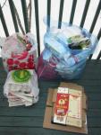 This is 2-4 weeks’ worth of stuff depending on our last pick-up. Based on today’s sort-out, I would like to find a bulk source for Swiss-process decaf coffee, and switch over to loose tea. I will pass on the cheap bags of onions and buy them loose instead. We get a ludicrous amount of paper delivered to our door, such as flyers and community newspapers. I will try to find a phone number to opt out. We gave up using paper towel last month (switching over to rags) and so far it hasn’t been a problem. I realize that almost all recyclables can be used as crafts materials but I don’t currently have any crafty scavengers around to use them!
