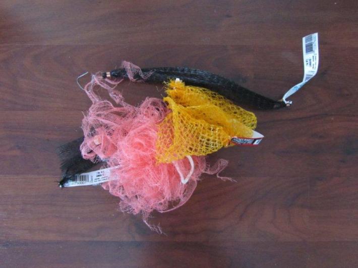 Netting bags from onions and a pommelo; bath puff that was attacked by the cats!