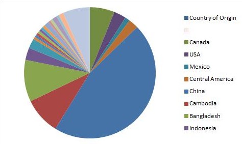 I was surprised that 6% of my clothes were made in Canada, and 10% total in the Canada/USA/Mexico free trade zone. Some of those items are quite old (such as a coat and boots) and I wouldn’t be able to replace them with locally made ones.