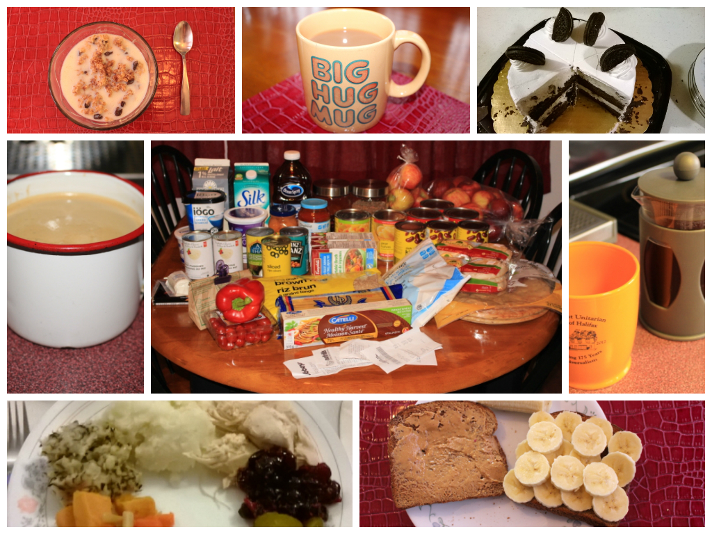 Sun Feb 2 (clockwise from top left): oatmeal with raisins and walnuts, tea, ice cream cake from Mom’s house (!), half-caff coffee, toast with PB and banana, Sunday chicken dinner at parent’s place (not veg obviously), Americano coffee. In centre: weekly grocery shop. Not shown: white wine