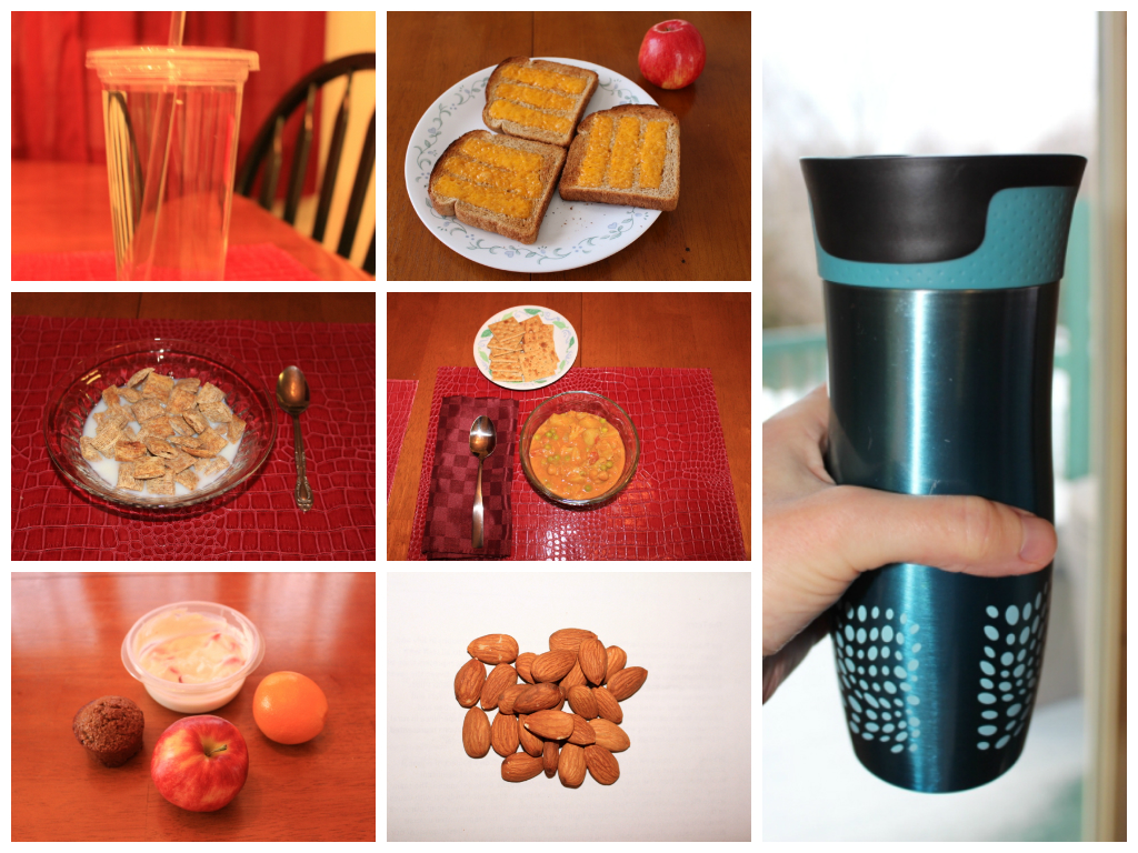 Tues Feb 4: Left column – in which water makes an appearance, spoon size shredded wheat cereal, work snacks. Middle column: cheese toast for lunch (needed more cheese), leftover curry and some crackers, a handful of almonds. At right: my ever-present travel mug (coffee and more coffee)