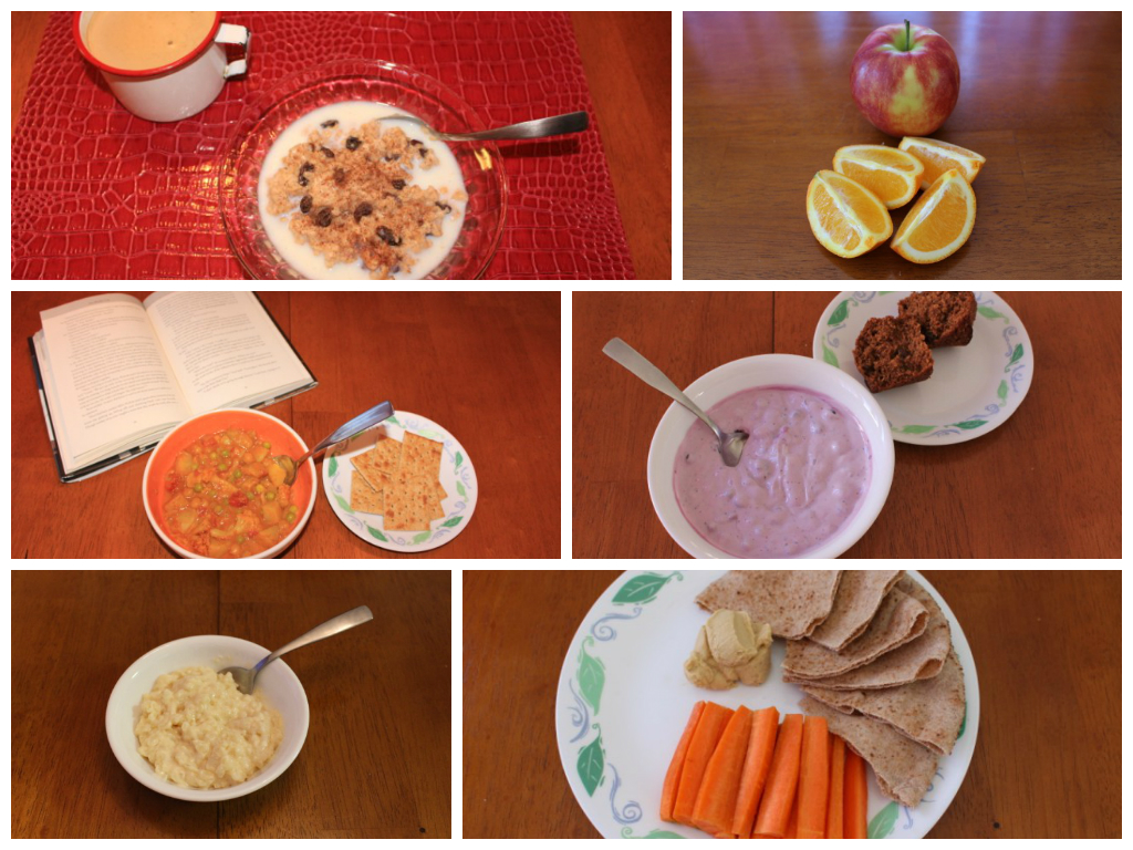 Thurs Feb 6 (clockwise from top left): oatmeal with raisins and walnuts, fruit for work, yogurt and muffin, hummus/pita bread/carrots for lunch. rice pudding from a can, curry and crackers and a good book. Not shown: a glass of water (maybe I should take up Sarah’s challenge after all! ) and a few more coffees