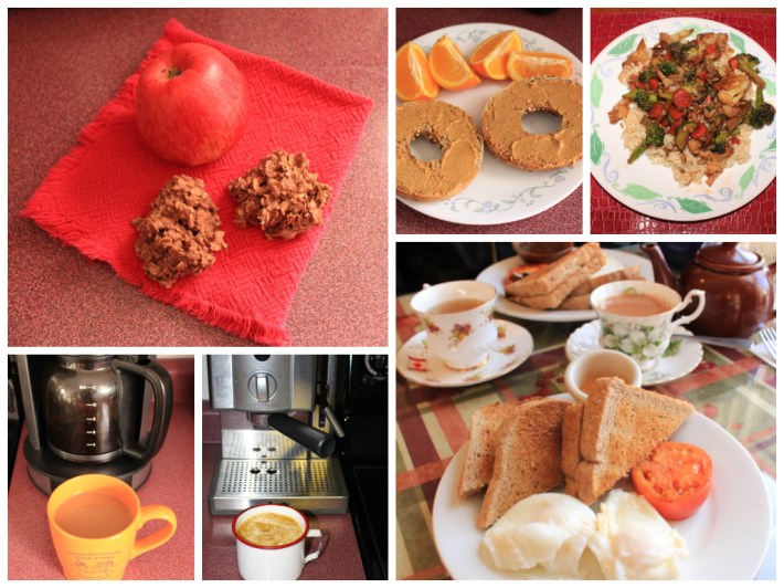 Feb 1: bagel, cafe breakfast, stir fry, no-bake macaroons, apple, coffee