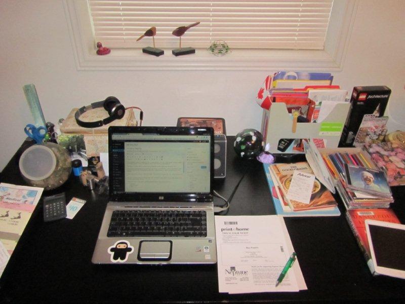 Current state of my desk top (somewhat tidied for photo): includes bills, coupons, receipts, programs, tickets, lists, cookbooks, book, etc.