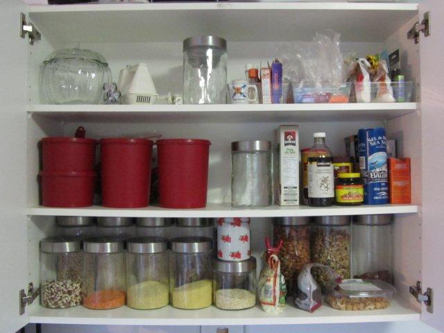 The last time I reorganized my food cupboards was about two years ago! Yesterday I tidied them up and took stock. When I started eating vegetarian, I thought I would want a huge array of dried beans and grains on hand all the time. Instead we eat a good variety, and mostly buy small amounts at a time. We can get most things cheaply from the Bulk Barn, but I do buy massive packages of nuts and raisins at Costco!