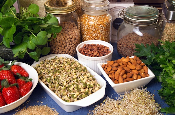• (At left) Dried chick peas and pinto beans, white and brown rice, whole wheat and white pasta (rotini), red lentils, millet, couscous, quinoa