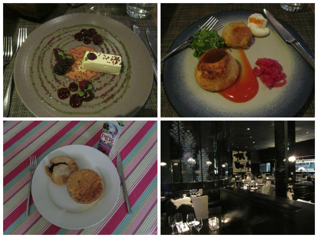 Top: two courses at vanilla Black. Bottom: conspicuously vegetable-free takeout meal; snazzy restaurant for carnivores at the O2
