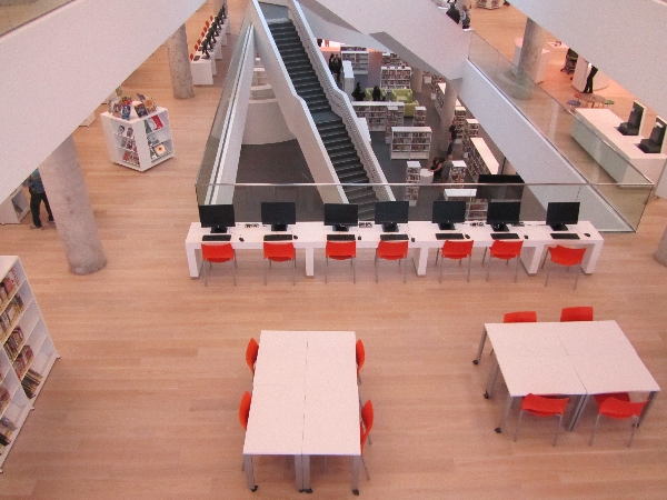 Floors 3, 4 and 5 are geared to grown-ups with all of our books, CDs, DVDs, study spaces and meeting rooms and computers. There are areas for literacy and language learning, cultural displays, local history research, author readings and events. I am not sure which I like best: the mix of places to socialize and the tucked-away quiet reading nooks; or the ranges upon ranges of gleaming new books, far surpassing our previous selection. I am always in a tizzy about what to read next and this will not help! I can actually see myself going here when I am not working in my own library. It feels like a vast, sunny plaza in which to bask in books and leisure (or in higher education and enlightenment, if you wish!)