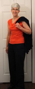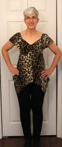 Since I do like a crisp, streamlined look, I own button-up shirts, t-shirts, and cardigans. Last summer I bought a few “tops” for variety. Each was a single colour, but they introduced different profiles. This year, I’ve been cautiously seeking patterned tops, only to find my tastes in patterns haven’t changed. I don’t like boho or floral. I am not interested in off-shoulder, cold-shoulder or unsymmetrical. I don’t like anything flow-y or drape-y. I was, however, looking for an animal-print top so I ended up ordering one online that broke all my rules. Otherwise, the patterns I do like are stripes, geometrics and colour-block.