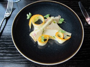 Since Rom doesn’t drink alcohol, I decided not to order the wine pairing menu. Perhaps the server was concerned when I started with a glass of inexpensive Prosecco, but I was redeemed in the sommelier’s eyes with my choice of a dessert wine later. Rom tried a non-alcoholic “gin” called Seedlip: who knew there was such a thing?