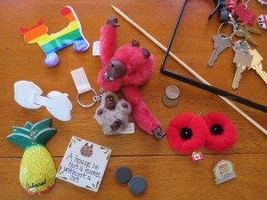 There were two gorilla key chains from my two Kipling bags, two fridge magnets which needed repair (keeping for sentimental reasons), one coin each from Ireland and Bermuda (I have not travelled to either place), a few enamel pins, a Pride cat sticker and some of my tangle of keys.