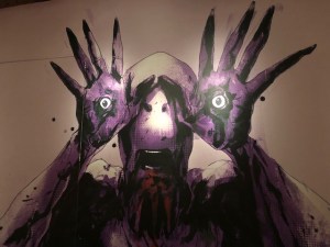 We made time for two big-ticket events. First, we went to the AGO to see the At Home with Monsters exhibit. The film director Guillermo del Toro loaned his distinctive collection of art, antique books, film costumes and props, and collectibles related to magic, fantasy, horror and comics. I have seen his films Pan’s Labyrinth, Hellboy (1 and 2) and Pacific Rim. I’m not a horror fan, but I can do creepy. I wasn’t sure I’d like the exhibit, but I was taken by the books, drawings, and costumes.