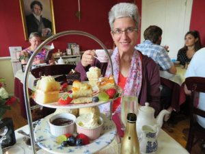 After I got that out of my system, we moved on to the Jane Austen Centre. This is another museum-in-a-house, on the same street and in the same style as a home in which the Austens briefly resided. Each room has talks by costumed guides, films or exhibits. They’re not set up like rooms in a house. I liked hearing the info about all the Austen family members, and I liked the artifacts from everyday life in the Regency era (such as making tea and letter writing). There was a dress-up area, too! There is a waxwork figure of Jane, but in it, she appears so different from her other portraits that it beggars belief. We had “tea for lunch” upstairs in their tea room, with sandwiches, scones and cakes. Over all, the Centre was a little bit precious, a little bit irreverent, and a lot of fun.
