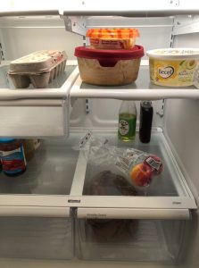 March 31: 1 egg, hummus, peanut butter, vegan marg, condiments (pickles and jam), lime cordial, maple syrup, 2 apples, onions!