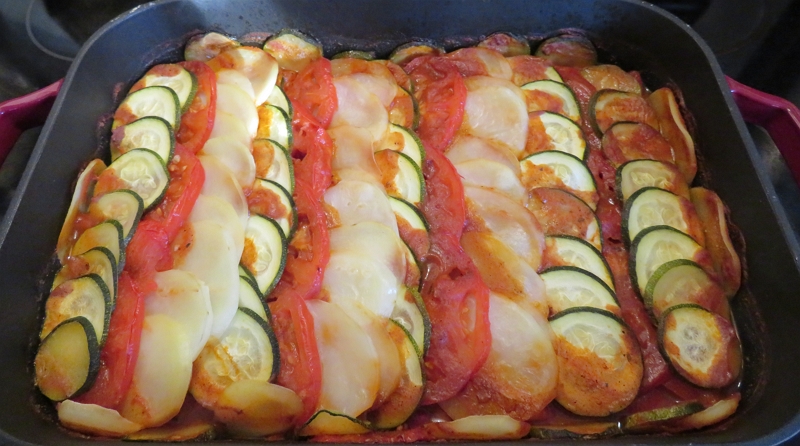 Baked chili topped with thin sliced potato, tomato and zucchini – from Plants-Only Kitchen by Gaz